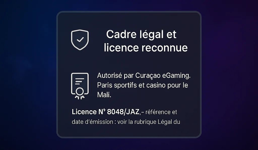 La plateforme opère sous licence internationale délivrée par Curaçao eGaming. La référence et la date d’émission sont indiquées dans la rubrique Légal du site. Cette autorisation couvre les paris sportifs et le casino pour les utilisateurs du Mali. Tu paries dans un cadre réglementé et contrôlé.